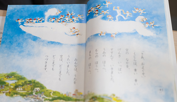くじら雲の名前は、小学校1年生の国語の教科書に載っているお話『くじら雲』が由来です。 お話では、子供たちは空に浮かぶくじら雲に乗りたくて、校庭で高く高くジャンプをします。 くじら雲は「もっともっと」と応援し、最後には子供たちも風に乗り、くじら雲の背中へ飛び乗っていきます。